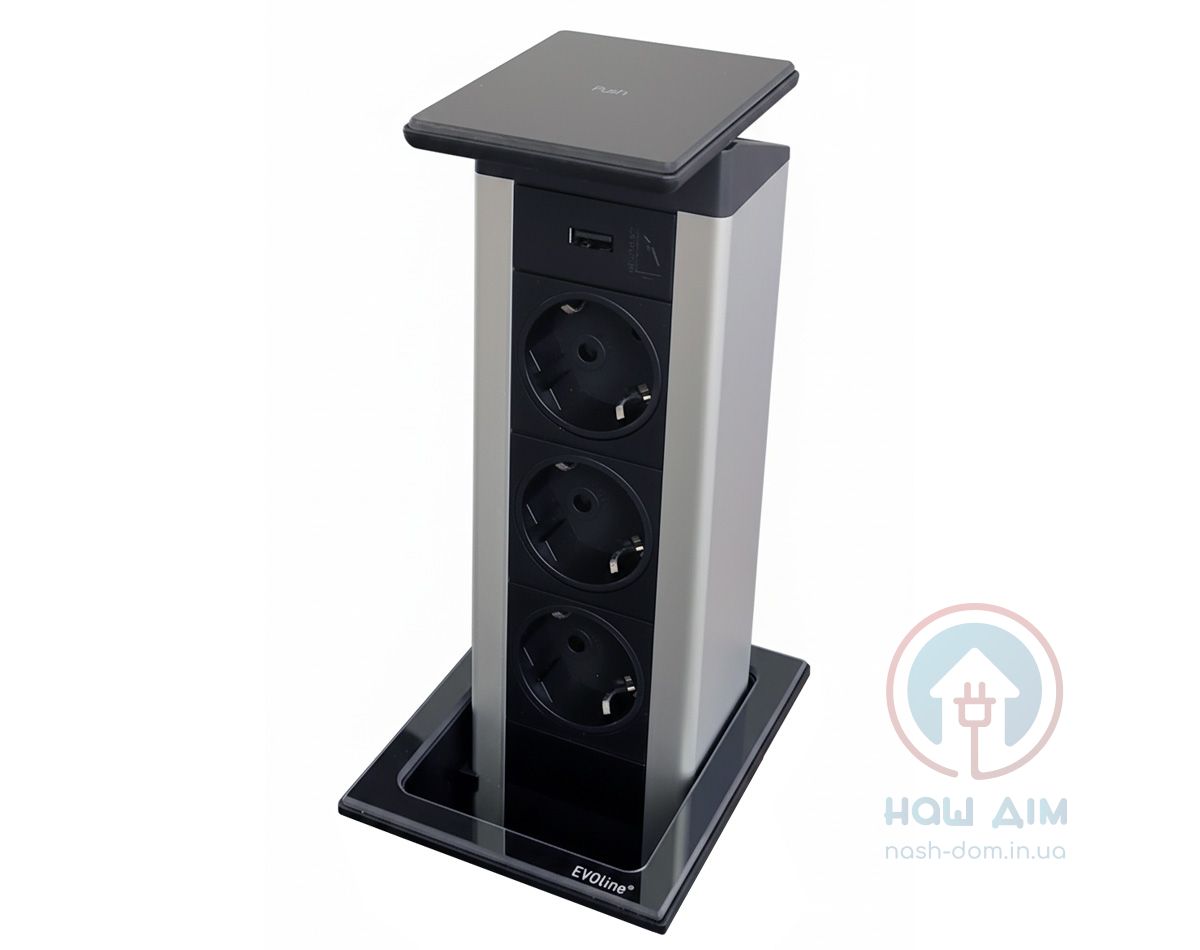 Висувний блок EVOline Port Push 3x220+USB-A. Чорне скло