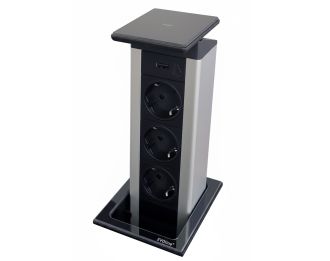 Висувний блок електроживлення для кухні, офісу або переговорної зони, де важливі дизайн і порядок - EVOline Port Push - елегантний корпус з кришкою з глянцевого чорного скла.